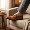 Nossos sapatos são produzidos no Brasil com excelência em qualidade e acabamento. Feitos com couro padrão exportação, possuem um design sofisticado e durabilidade excepcional. O solado em couro confere requinte e resistência, garantindo conforto e flexibilidade ao caminhar. O forro interno em couro vacum proporciona respirabilidade e maciez, tornando o calçado ainda mais confortável para o uso diário.